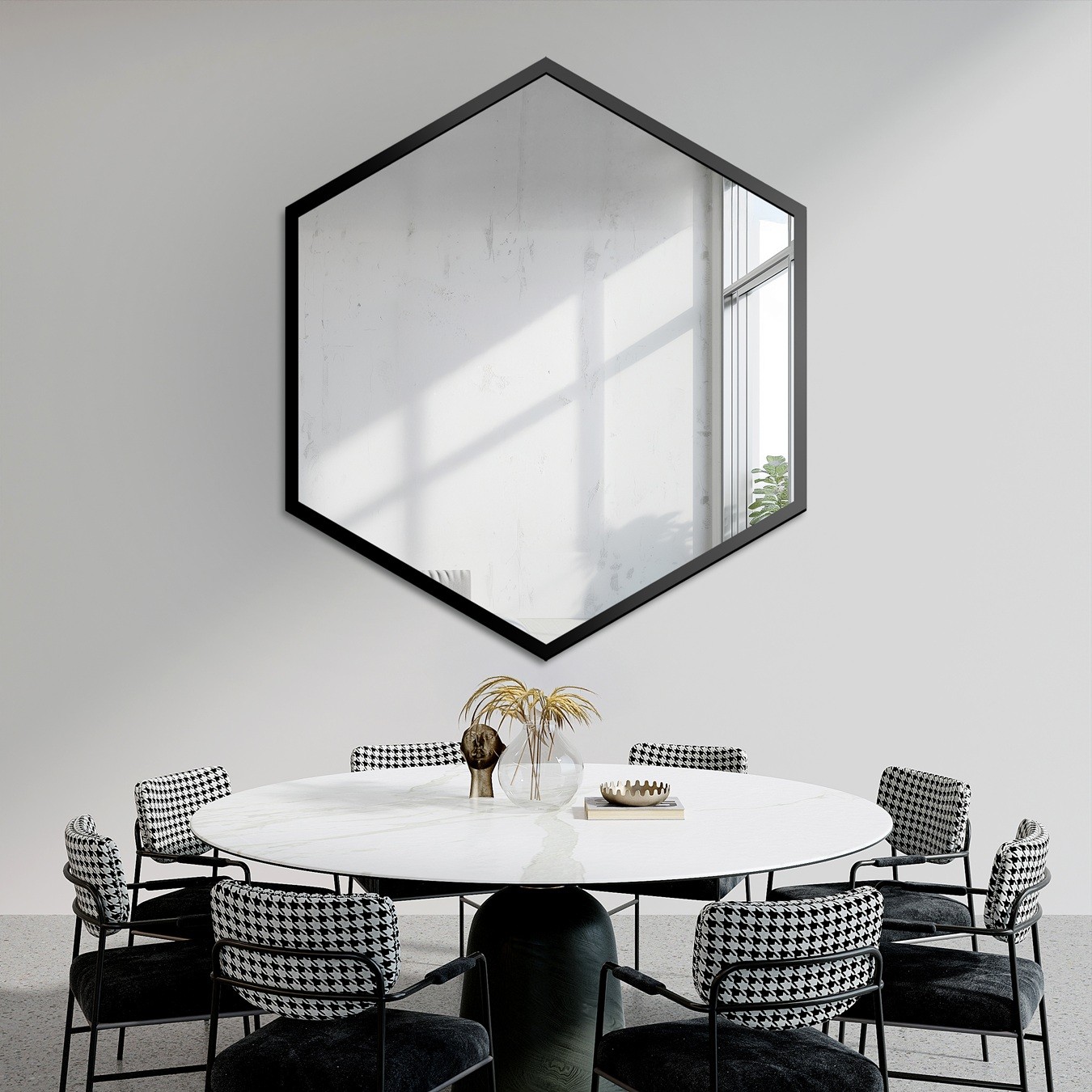 Ganz andere Assoziationen und Emotionen wecken Spiegel mit scharfen Winkeln — gleichseitige Dreiecke oder Rhomben. Sie bringen Energie, Dynamik, Bewegung und Struktur in den Raum. Diese Formensprache ist jedoch weniger klassisch als gerade oder abgerundete Linien, die üblicherweise in Interieurs erscheinen. Deshalb lohnt es sich, das Motiv in weiteren Elementen der Einrichtung aufzugreifen: als Muster an der Wand und auf Textilien, als Accessoire oder Dekoration mit ähnlicher Kontur. Gleiches gilt für die etwas milder wirkenden regelmäßigen Vielecke wie Hexagone, Fünf- oder Achtecke, die sich sowohl als Einzelstück im Flur als auch als stilvolle Gruppe im Wohnraum inszenieren lassen.