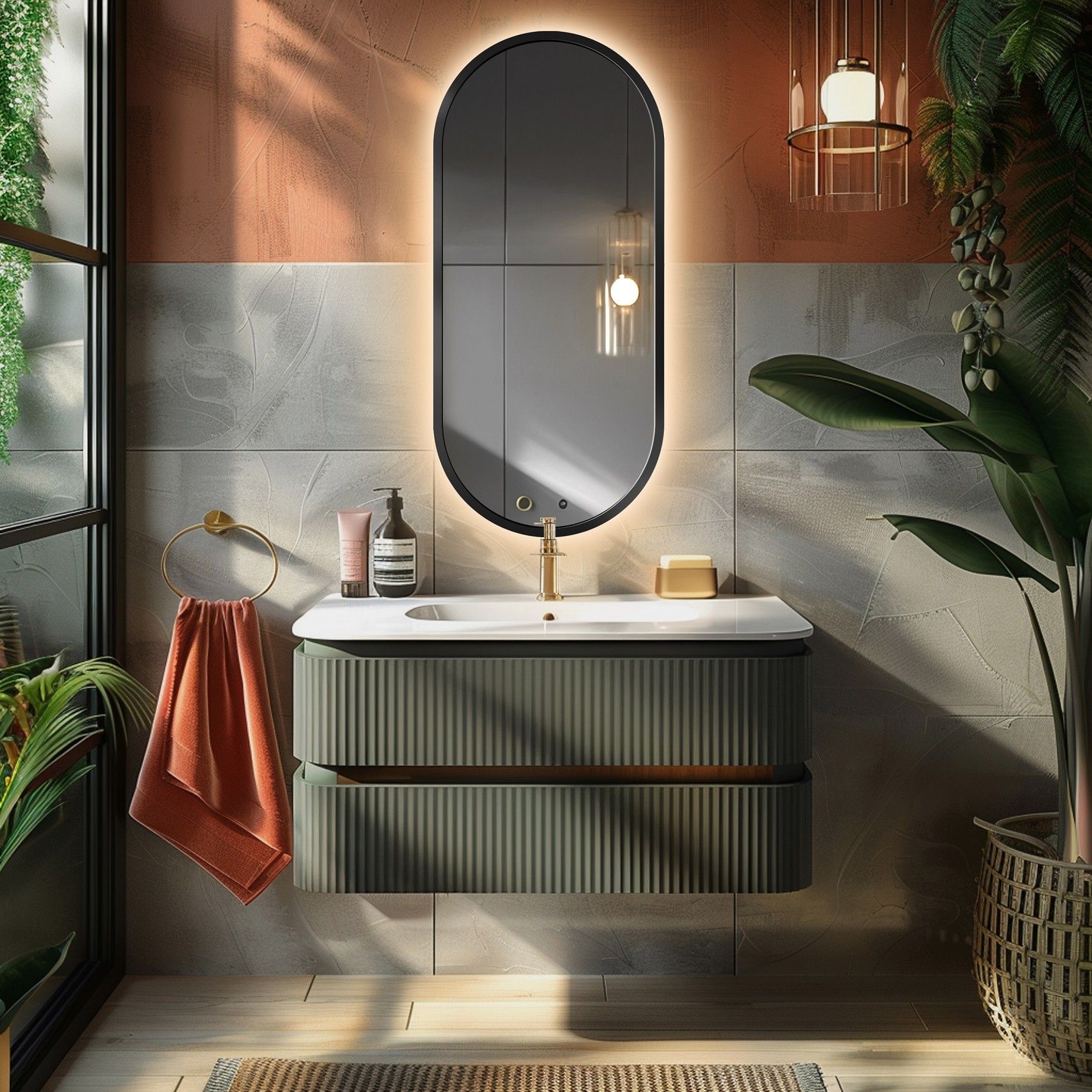 Vor allem vergrößern Spiegel optisch Innenräume und reflektieren Licht, wodurch sie diese aufhellen. Daher passen sie an sich perfekt zu diesem Stil, der Großzügigkeit und viel Licht schätzt. Zum Thema Licht ist hinzuzufügen, dass in jenen Jahren die LED-Technologie nicht bekannt war. Wenn Spiegel Beleuchtung hatten, basierte sie auf traditionellen Glühbirnen und war vom für diesen Stil charakteristischen Design inspiriert. Heute kann man für solche Arrangements LED-Spiegel wählen, es sollte jedoch wärmeres und subtileres Licht sein. Es lohnt sich auch, zu Modellen im Retro- und Vintage-Stil zu greifen. Darüber hinaus eignen sich Spiegel in Holzrahmen sowie solche, die Holz oder andere natürliche Materialien imitieren.
